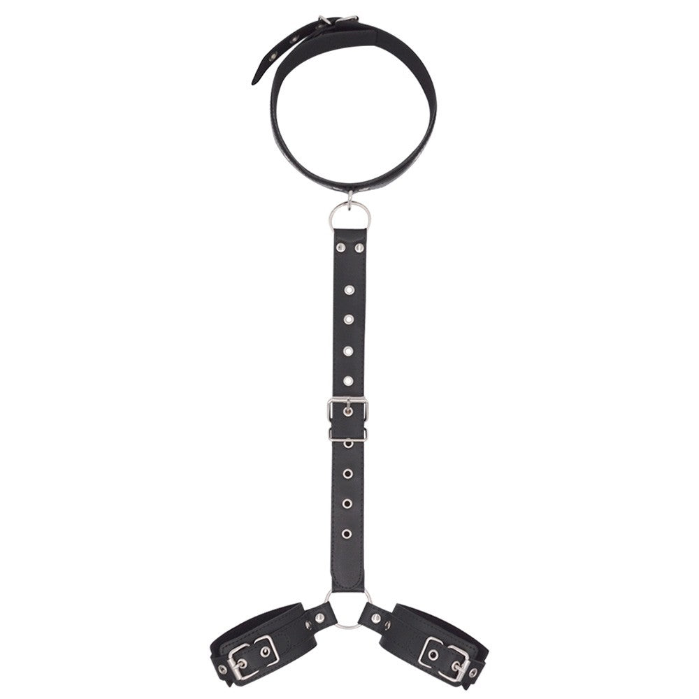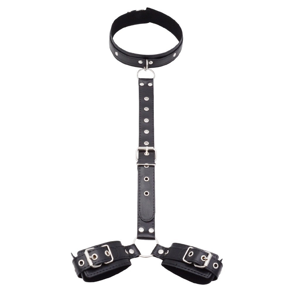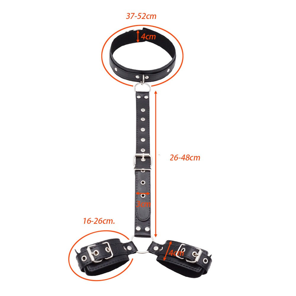 This adjustable wrist-to-collar restraint is all about connection—literally. A classic black leather design links the collar to the wrist cuffs, gently reminding your partner who’s in charge and how far they can move. The connector strap features multiple metal eyelets, making it easy to dial in the exact level of restriction you’re craving. Both the collar and cuffs fasten with sturdy roller buckles for a secure, no-nonsense fit. Whether you’re experimenting with light restraint or setting the mood for deeper submission, this piece keeps things comfortable, controlled, and just restrictive enough to make every movement feel intentional. Perfect for bondage beginners and experienced players alike, it’s a simple setup with endless possibilities. Dimensions: Collar adjustable: 14.6–20.5 inches (37–52cm) Wrist cuffs adjustable: 6.3–10.2 inches (16–26cm) Neck-to-wrist connector length: 10.2–18.9 inches (26–48cm) |