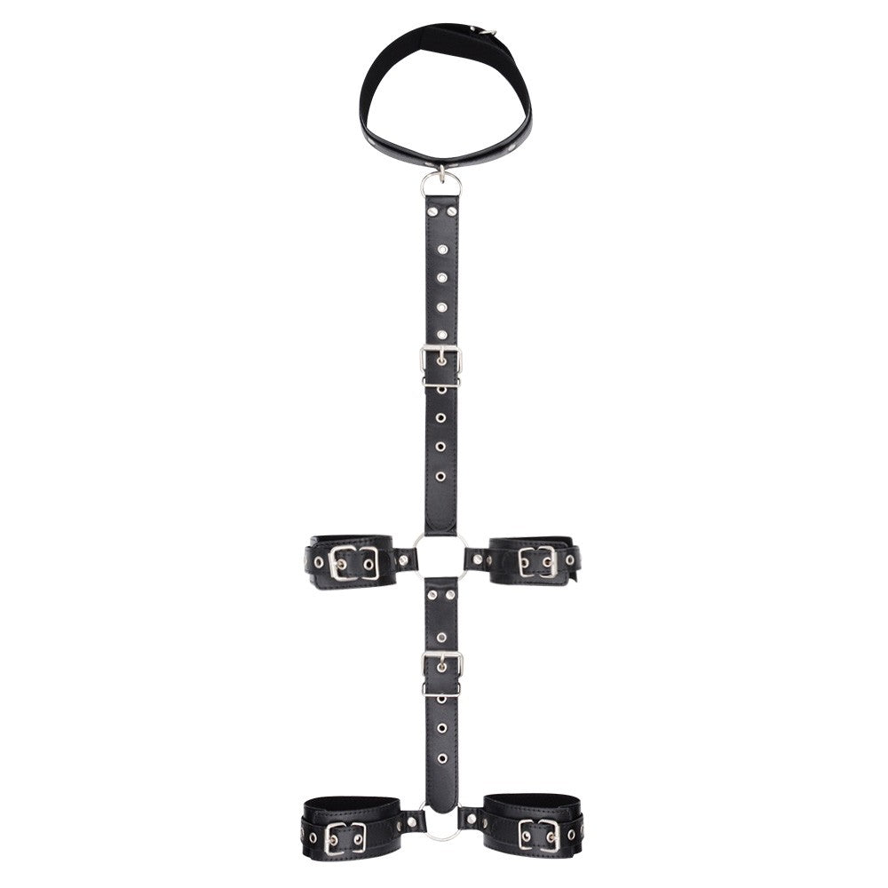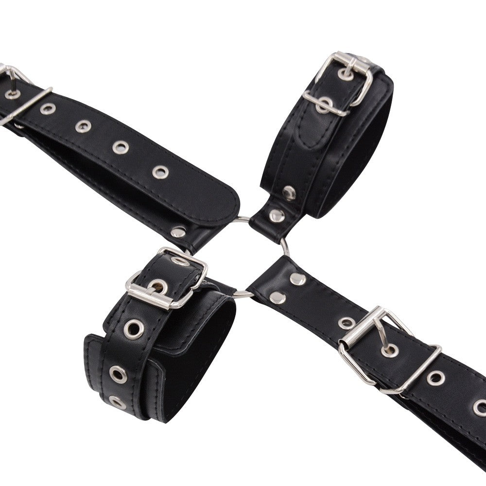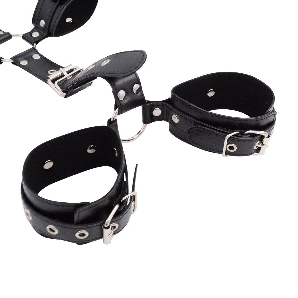 This leather back-bind restraint system is all about structure—and once it’s on, that structure is very clear. A solid leather collar sits at the top, acting as the anchor point for the entire setup. From there, a reinforced vertical spine strap runs straight down the back, becoming the backbone that keeps everything locked into place. The wrists are secured behind the body via a horizontal connecting strap fixed to the spine, forcing the arms into a classic restrained position that limits movement without relying on guesswork. Below that, the same spine strap continues downward to connect the ankle cuffs, creating a single, unified restraint system from neck to ankles. Every movement pulls against the same central line—simple, effective, and very unforgiving. Each cuff features adjustable roller buckles and multiple eyelets, allowing you to dial in both fit and restriction level. The wide leather design helps distribute pressure evenly, making longer scenes more manageable while still delivering that unmistakable sense of control. Finished with smooth, polished metal hardware, this set is ideal for players who appreciate clean restraint mechanics, clear power dynamics, and zero slack. Dimensions: Collar adjustable: 14.2–20.9 in (36–53 cm) Neck-to-wrist connection: 9.1–18.1 in (23–46 cm) Wrist cuffs adjustable: 6.3–9.4 in (16–24 cm) Wrist-to-ankle connection: 7.5–11.8 in (19–30 cm) Ankle cuffs adjustable: 6.7–11.0 in (17–28 cm) |