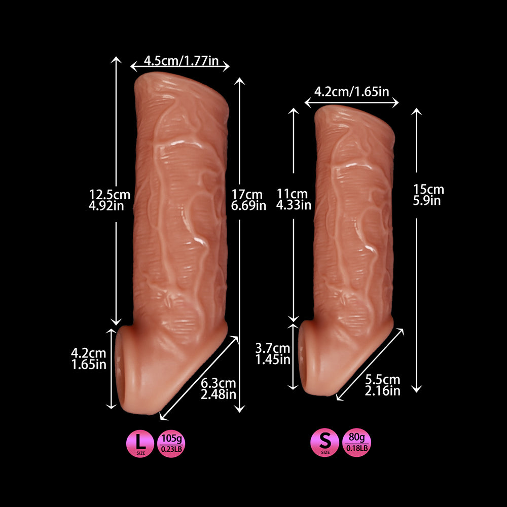 Looking for more girth while still keeping that delicious head sensitivity? This open-ended penis sleeve is the best of both worlds. It slides over your shaft to add extra thickness and texture, while the tip stays uncovered for direct contact and maximum pleasure. Made from soft liquid silicone rubber, the sleeve feels incredibly lifelike, with a supple stretch that fits a variety of sizes. It can expand far beyond its normal shape, making it a comfortable option for most users. Whether you’re naturally slender or already well-equipped, this sleeve brings that “extra something” to the experience. A built-in ball loop wraps underneath for a secure fit and an extra tug of pleasure around the boys. Once you’re in, coat the inside and outside with water-based lube for smooth, slippery fun, then enjoy enhanced sensations for both partners. Perfect for adding girth, boosting stimulation, and enjoying a natural-feeling upgrade—without hiding your favorite part. |