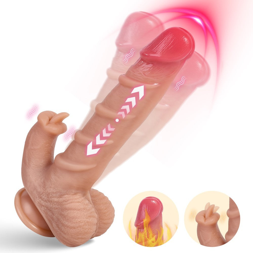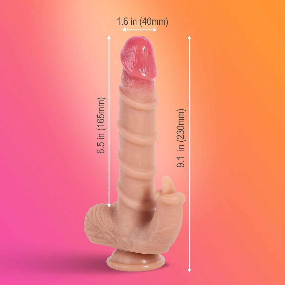 If you like your toys a little more lifelike, this one checks all the boxes—and then some. Designed with a detailed head, raised veins, and a spiral-textured shaft, this realistic dildo delivers layered stimulation that feels anything but ordinary. The magic is in the motion. With 10 thrusting and vibration modes, you can explore everything from slow, teasing builds to deeper, more intense rhythms. Add in the built-in heating function, and you get that warm, body-like touch that makes every moment feel more immersive. Feeling hands-free? The strong suction cup keeps it firmly in place on smooth surfaces, so you can sit back and enjoy. Or pass the remote to your partner and let them take control—you might not see it coming, but you’ll definitely feel it. Crafted from soft, body-safe liquid silicone, it’s smooth, flexible, and completely odor-free. The spiral texture adds extra stimulation with every movement, while a touch of water-based lubricant makes everything glide effortlessly. USB rechargeable and IPX5 waterproof, it’s easy to use, easy to clean, and always ready when you are. Size: Total Length: 9.1 in (230 mm) Insertable Length: 6.5 in (165 mm) Diameter: 1.6 in (40 mm) Battery Info (Remote): Requires 1 × CR2032 battery (included). Keep out of reach of children. If swallowed, seek medical attention immediately. In the Box: Vibrating Dildo × 1 Remote Control × 1 USB Charging Cable × 1 User Manual × 1 |
