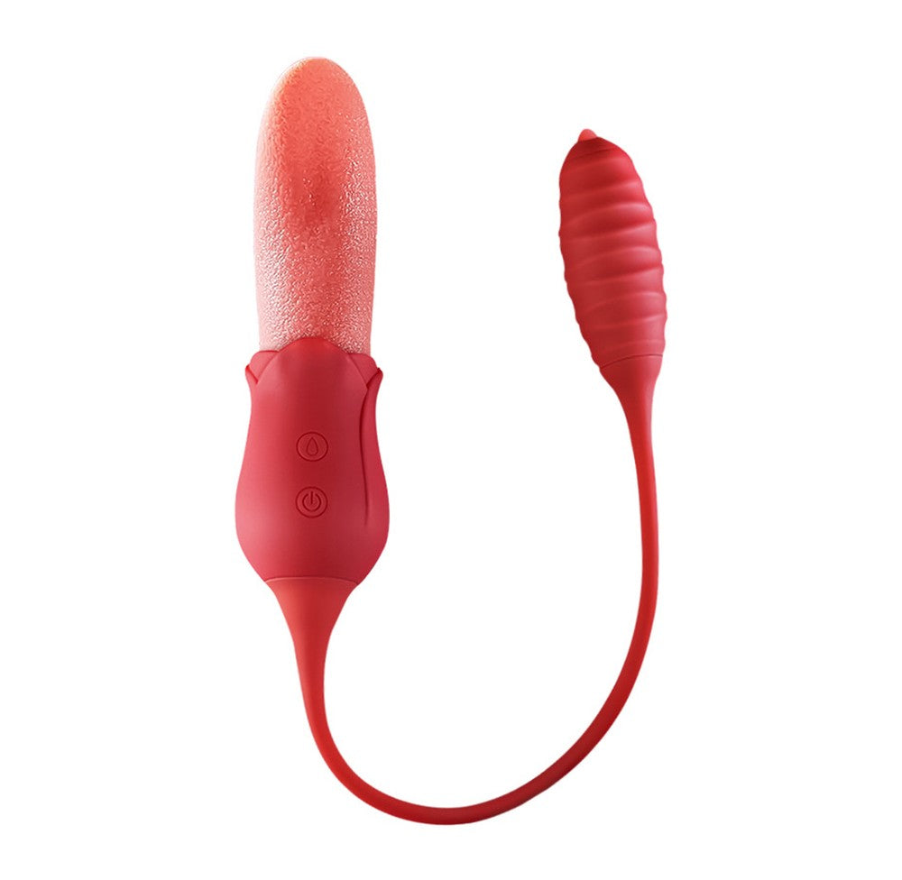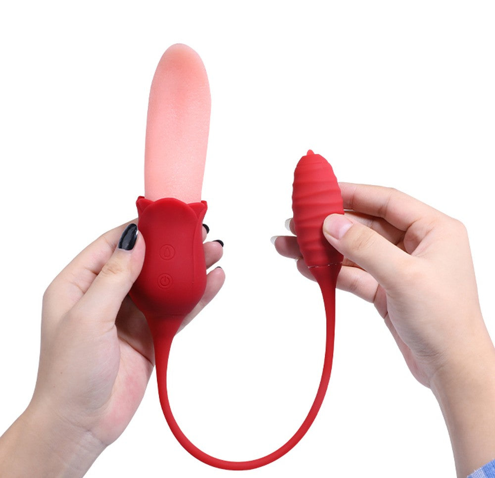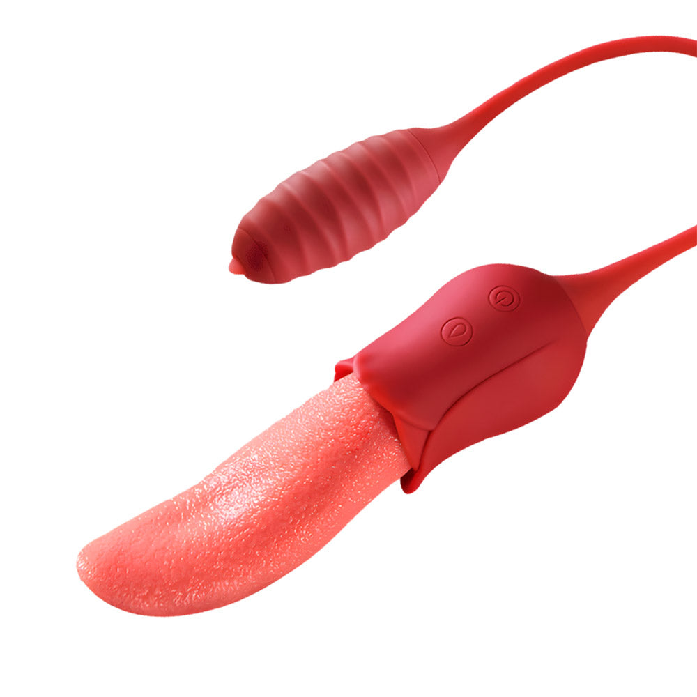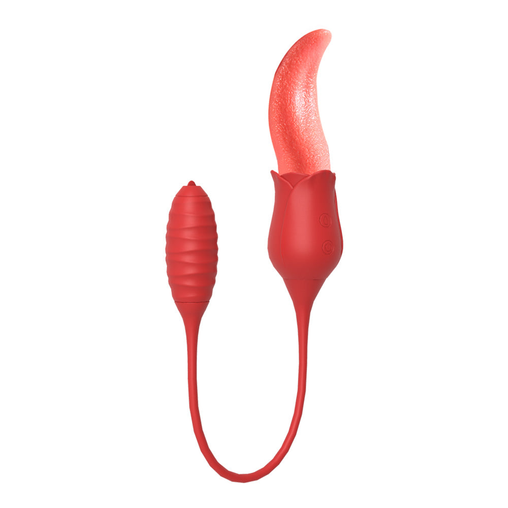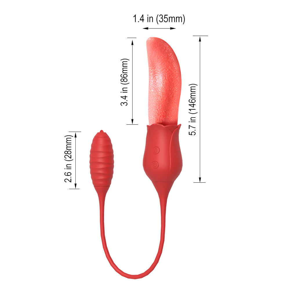 Double the fun, double the teasing! This 2-in-1 vibrator features a soft, textured rose tongue on one end and a powerful bullet on the other, connected by a flexible silicone cord. The tongue flicks, twists, and teases at high speed, perfect for clitoral or nipple play, or even gentle G-spot exploration. Meanwhile, the bullet vibrates intensely inside, with a tiny tip that mimics tongue-like stimulation to tease any sensitive spot. Switch between 10 combined modes for sensations that are playful, intense, or anywhere in between. Made from silky, medical-grade silicone, it’s soft, safe, waterproof, and whisper-quiet. Whether for solo sessions or playful couple fun, this little duo is ready to thrill. For the best experience, apply plenty of water-based lubricant before use to enhance comfort and maximize sensation. Dimensions: Length: 6.1 in (155 mm) Width: 1.8 in (46 mm) Insertable Length (bullet end): 2.8 in (72 mm) What’s in the Box 2-in-1 Rose Tongue & Bullet Vibrator × 1 Charging Cable × 1 Manual × 1 |