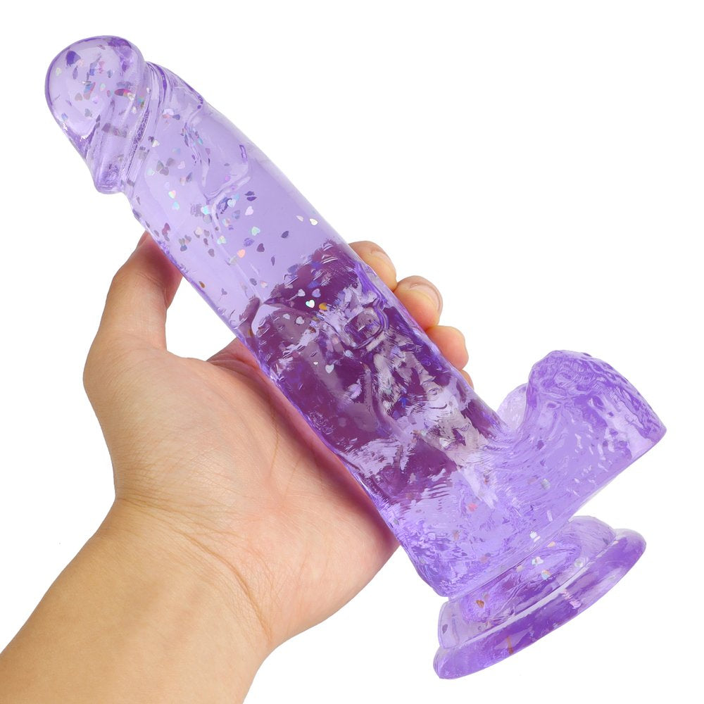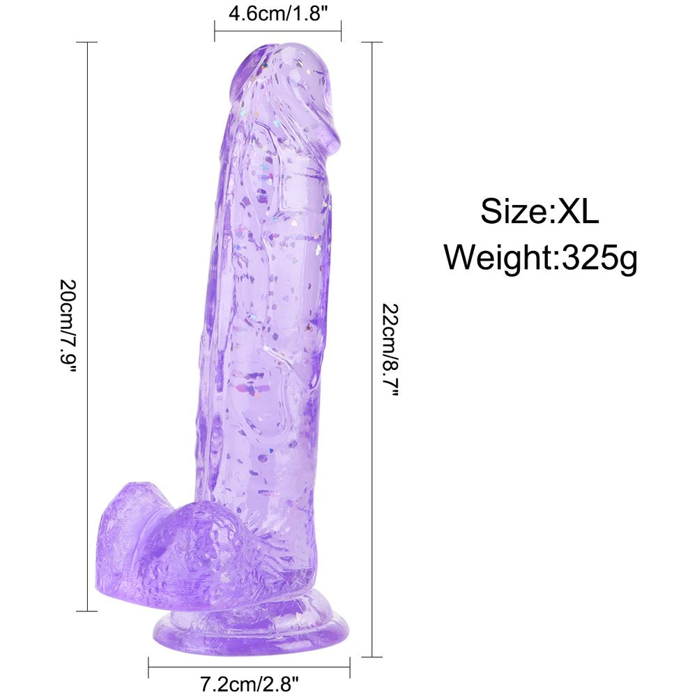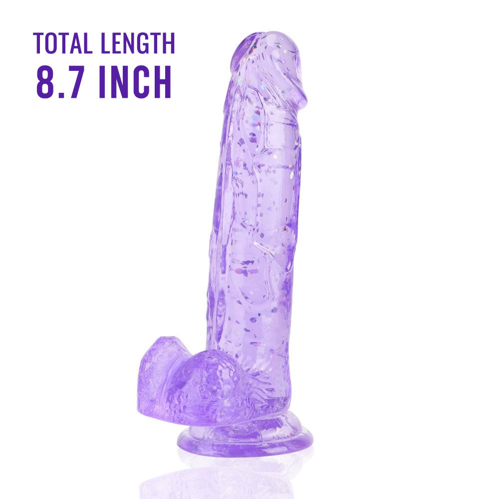 Get ready to level up your pleasure game with the Sparkle Ultra Realistic Suction Cup Dildo in Purple. With an 8.7-inch total length and 6.7-inch insertable length, this bold and flexible companion is perfect for more experienced adventurers. Firm, textured balls offer precise external stimulation while the sturdy suction cup keeps things hands-free on any smooth surface. The transparent purple body with subtle glitter flakes adds a touch of fun, and premium TPE delivers a soft, lifelike, and safe experience. Add some water-based lube or pop it into a harness for endless exploration. |
