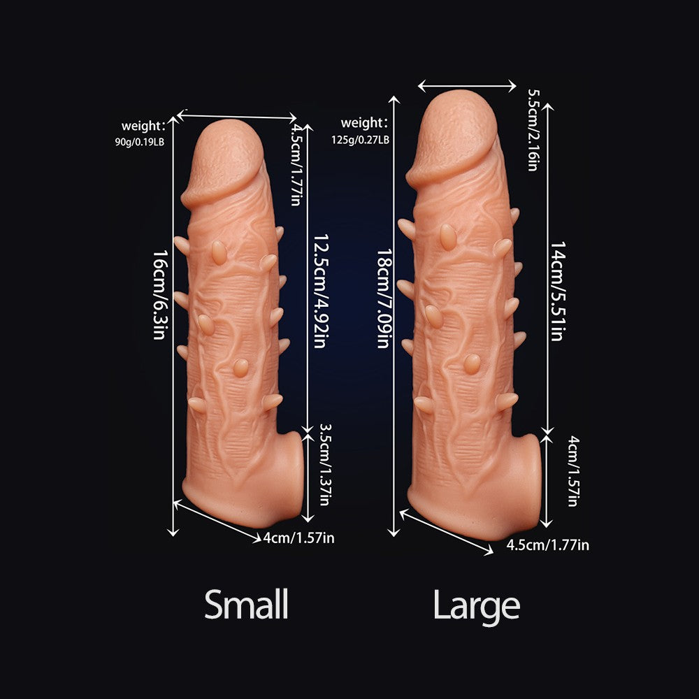 If “just a little more” sounds like music to your ears, this textured penis extender brings exactly that—and then some. Adding an extra 1.5 inches to your natural length, it wraps your shaft in soft silicone covered with raised bumps and veins designed to thrill your partner with every stroke. The exterior feels thick and substantial, while the inner canal hugs comfortably for a natural, connected sensation. The lifelike head and pronounced texture make penetration feel deeper, fuller, and more stimulating without sacrificing your own pleasure. A stretchy ball loop slips underneath to hold everything in place, so you can concentrate on movement instead of readjustment. Flexible liquid silicone rubber stretches to fit a range of sizes, making it a confident choice whether you’re boosting performance or trying something new for fun. Warm it up in water before play for a body-like feel, then add water-based lube inside and out for smooth, slippery, shared enjoyment. Please note: the internal length is 5 inches. |